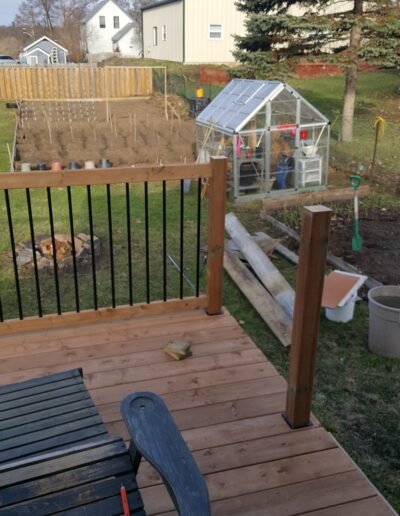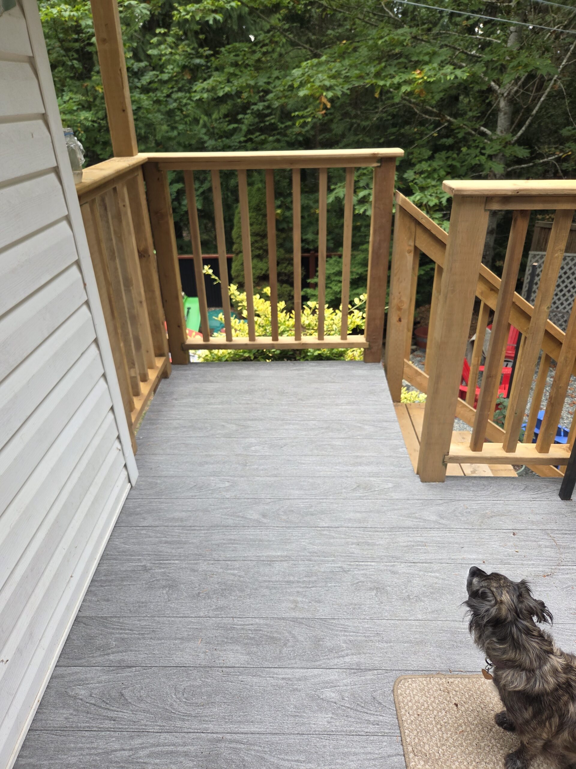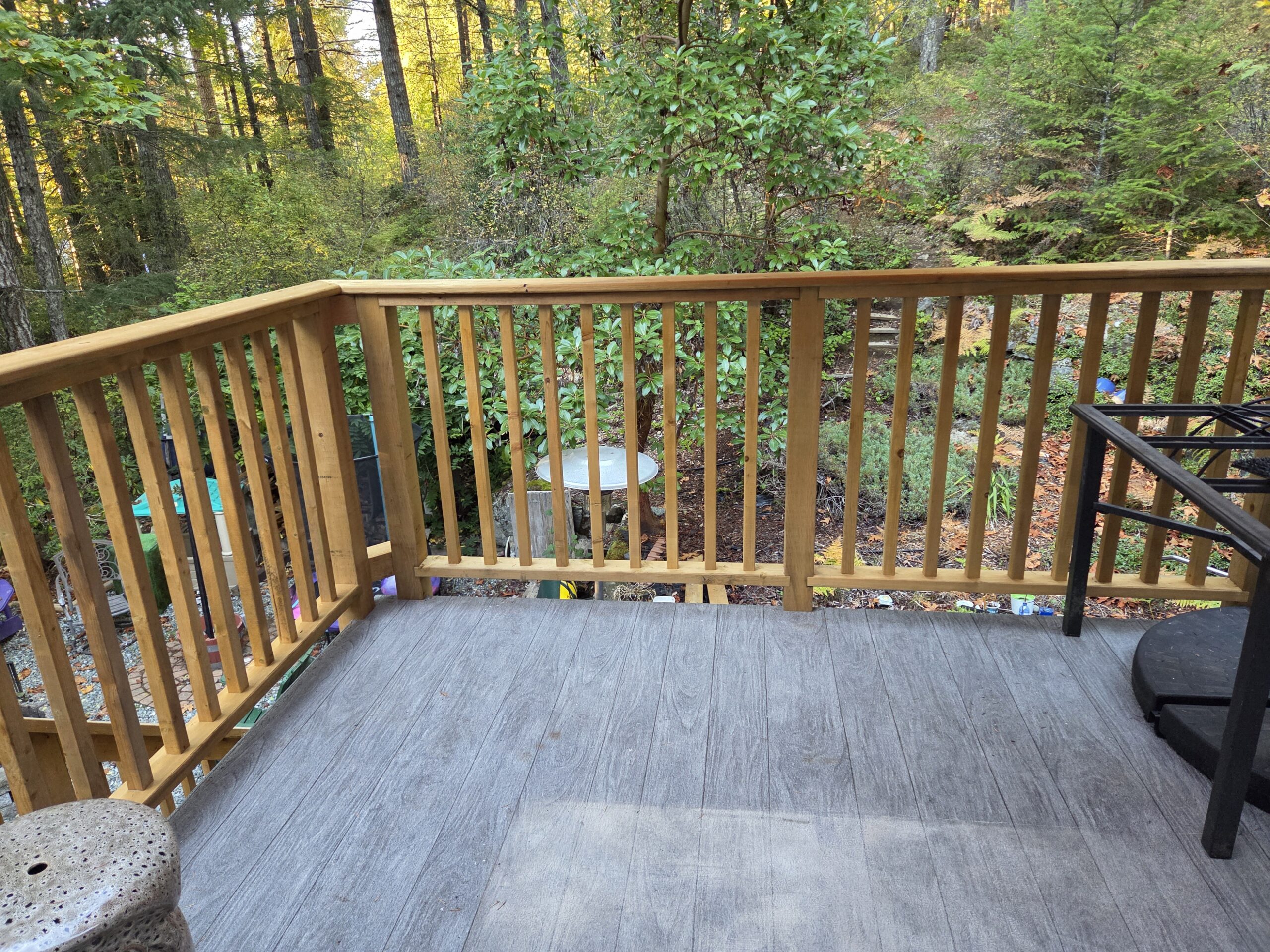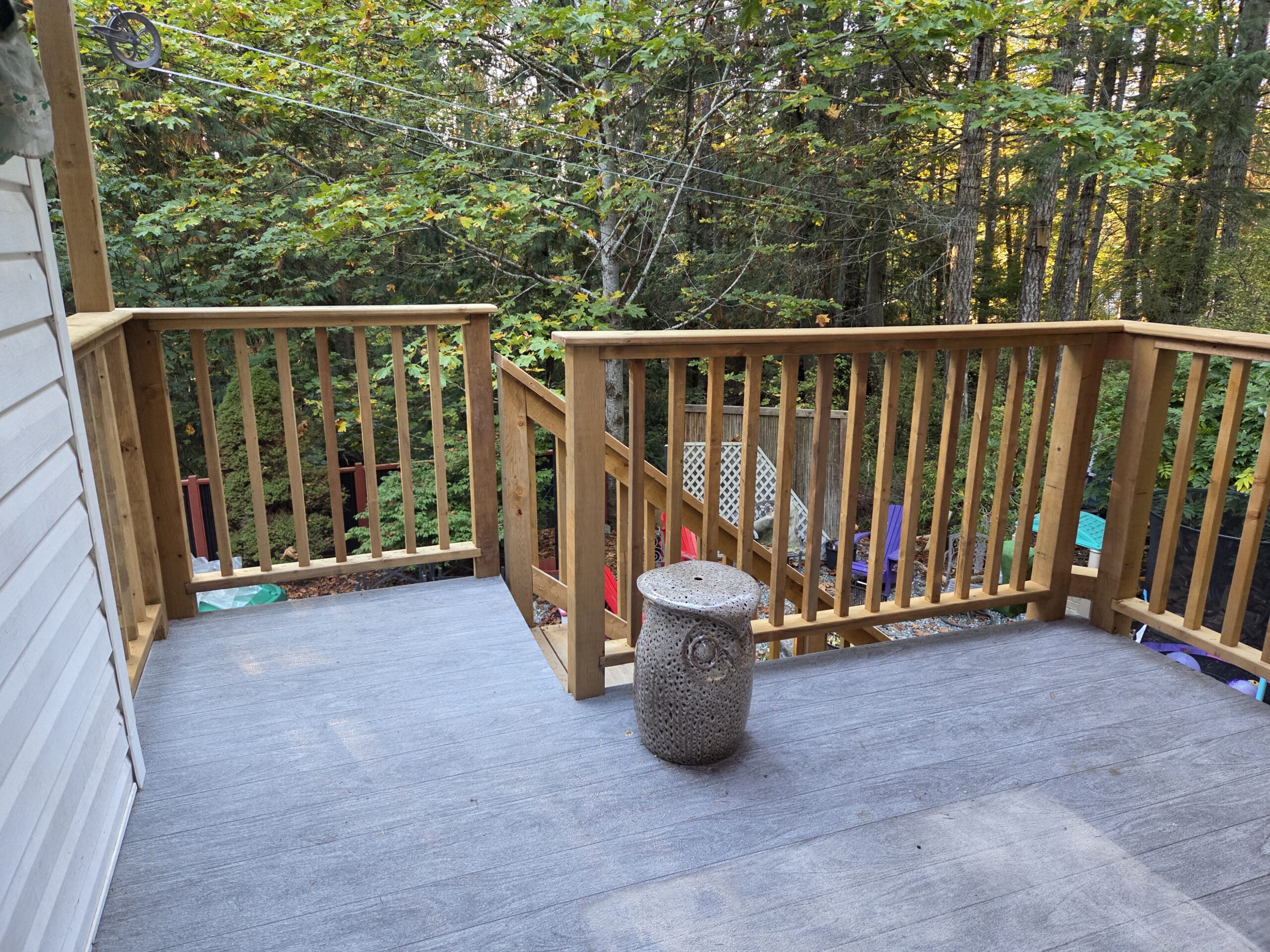 New Sienna-treated wood railings built by Steve’s Woodworking in Shawnigan Lake, providing a clean modern finish to the deck perimeter.