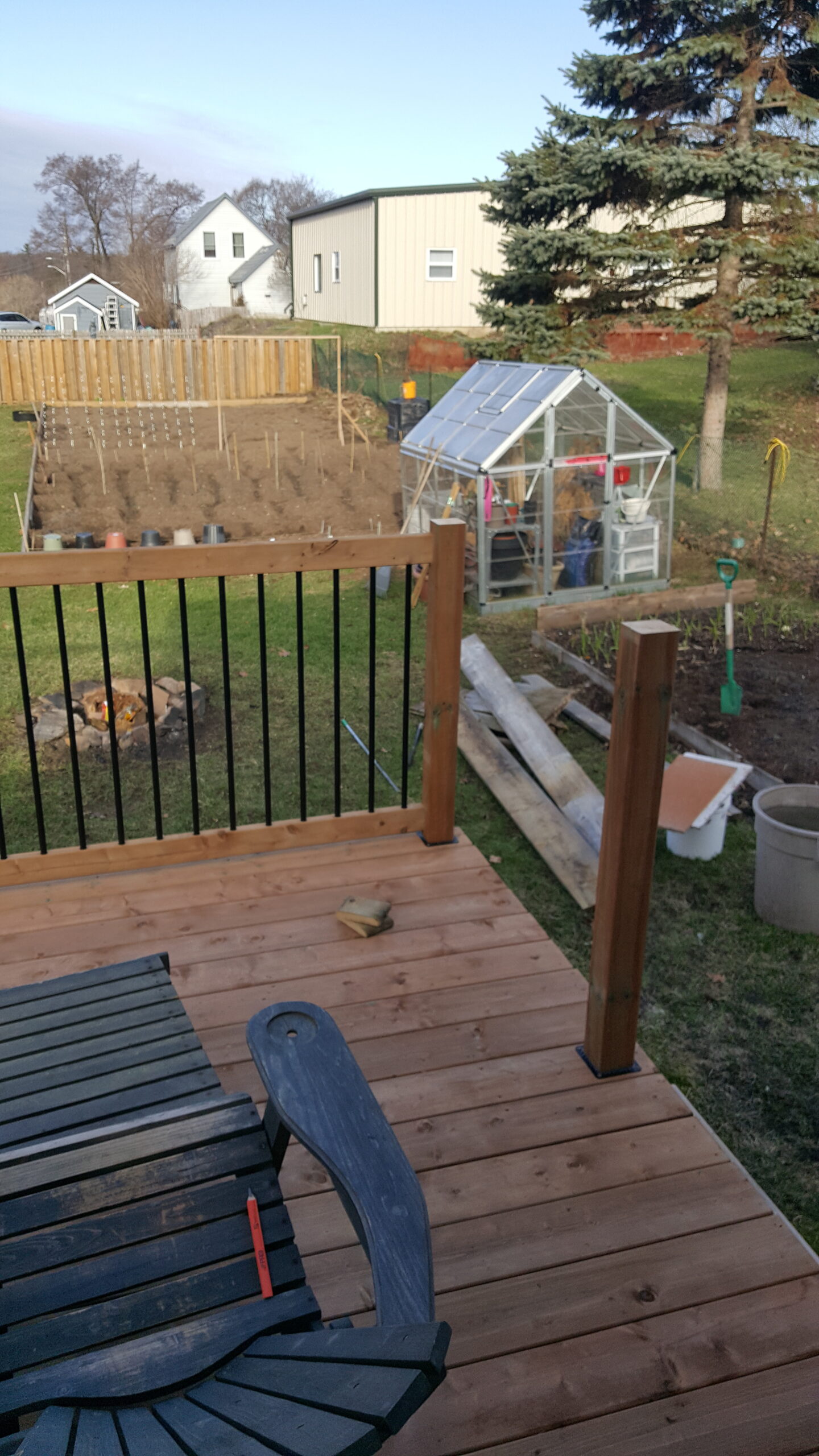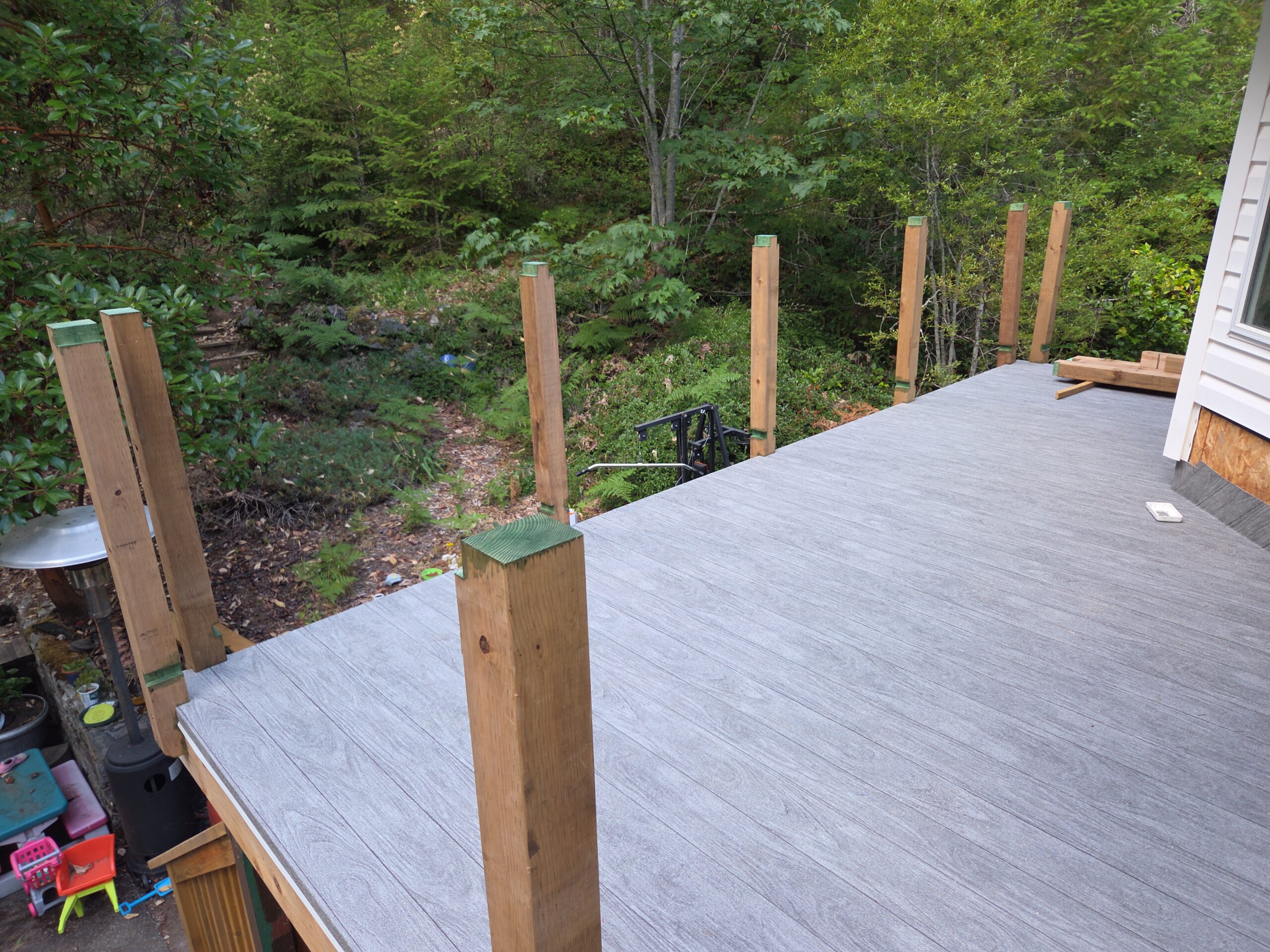 Construction stage of Sienna pressure-treated railings by Steve’s Woodworking in Shawnigan Lake, showing posts before top rails were added.
