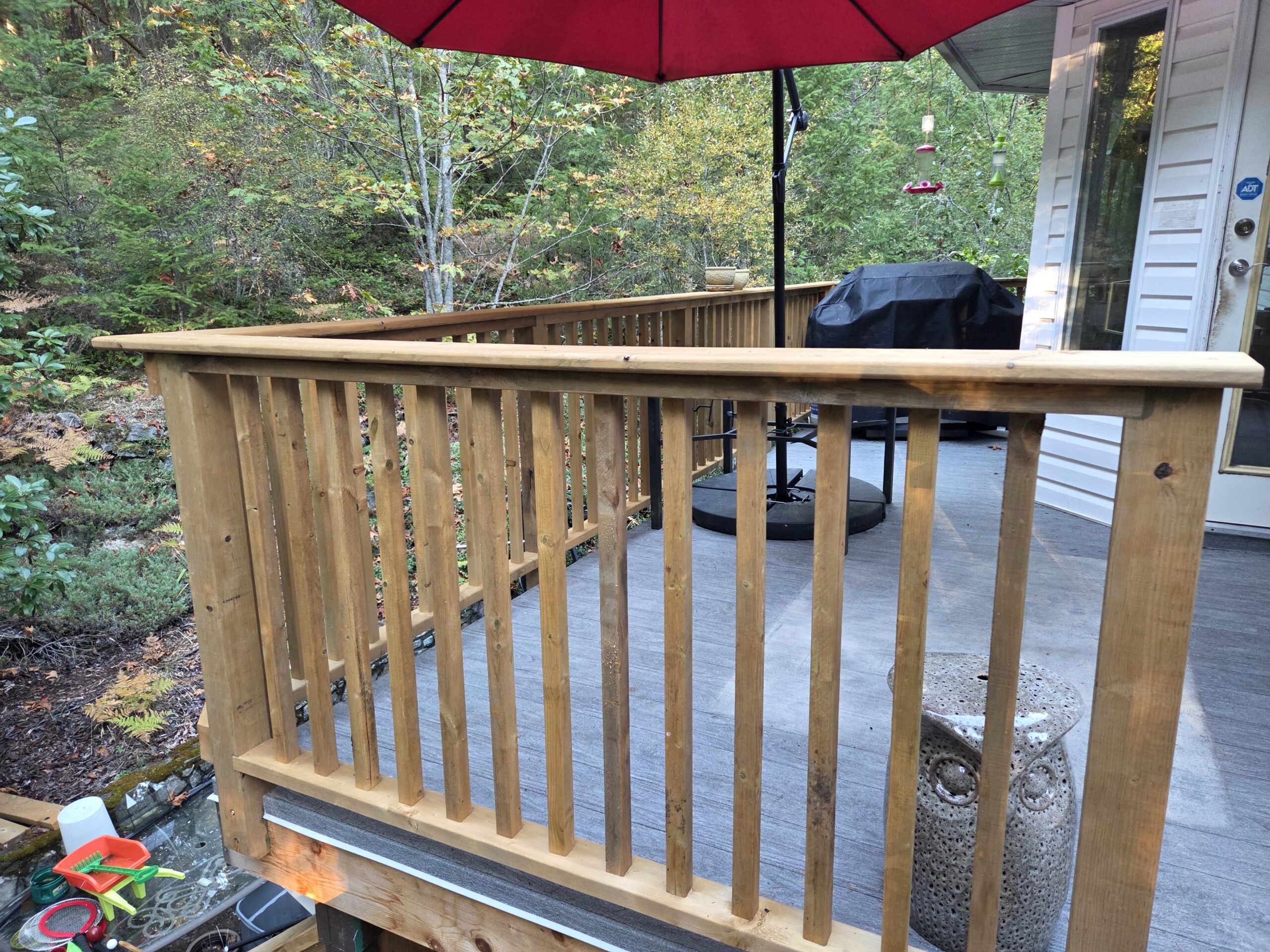 Completed corner section with new Sienna pressure-treated deck railings by Steve’s Woodworking in Shawnigan Lake, BC.